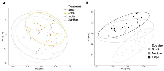 Changes in microbial community composition. (A) PCA plots by test article. (B) PCA plots by dog size. cRG-I, carrot rhamnogalacturonan-I.
