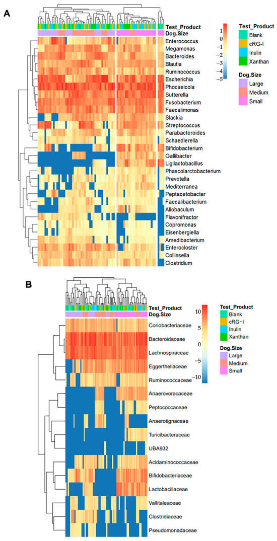 This was further visualized with a heatmap of the log10 relative abundance (with the addition of a 0.00001 pseudocount) of the top 30 bacterial genera (Figure 4A) and bacterial families (Figure 4B). Interestingly, in this cohort, the medium-sized and large dogs seem to lack Ligilactobacillus (formerly Lactobacillus) animalis and Bifidobacterium spp., and the sequencing data demonstrates a clustering of the small dog group while using unsupervised methods.