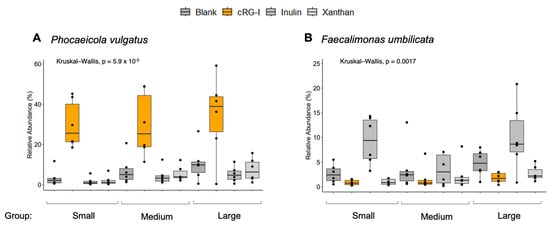 Relative abundance of (A) Phocaeicola vulgatus per treatment group and (B) Faecalimonas umbilicata per treatment group. Black dots in the figure represent outliers. cRG-I, carrot rhamnogalacturonan-I.