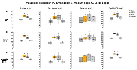 Monitoring the pH during a colonic incubation provides an indication of the production of microbial metabolites like SCFAs, lactate, and ammonium. The primary objective of pH measurement is to ensure the maintenance of physiological pH conditions throughout the incubation period. During the colonic incubations, the reduction in pH values was similar for cRG-I and inulin compared with the blank after 24 h and 48 h, demonstrating that each of the test products was fermented by the microbiota of dogs in each of the size categories (Table 2). No change in pH was observed in the medium-sized dogs treated with xanthan, with only 1/6 dogs having a response. A very small decrease in pH was observed in the small and large dogs. The starting pH in each Colon-on-a-plate® well was 6.50 ± 0.20, and the lowest pH measured at the end of the experiment was 6.04, which was well within the in vivo pH range (pH 5.0–6.9) [38], indicating that pH levels remained optimal throughout the experiment.