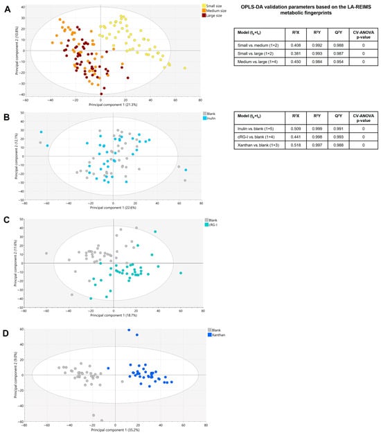 PCA-X-score plot based on LA-REIMS data (24 h and 48 h). (A) All biological samples (n = 144). (B) Blank versus inulin. (C) Blank versus cRG-I. (D) Blank versus xanthan. Associated iQC-samples were excluded from analysis. LA-REIMS metabolomic data were generated in negative ionization mode. OPLS-DA validation parameters for evaluation of various dog sizes and different treatments based on LA-REIMS metabolic fingerprints are also shown. ANCOVA, analysis of covariance; cRG-I, carrot rhamnogalacturonan-I; iQC, internal quality control; LA-REIMS, laser-assisted rapid evaporative ionization mass spectrometry; OPLS-DA, orthogonal partial least squares discriminant analysis; PCA-X, unsupervised principal component analysis, t time; Q2Y quality parameter; R2X the model performance; R2Y the ability to predict the Y-data for the specifically used dataset.