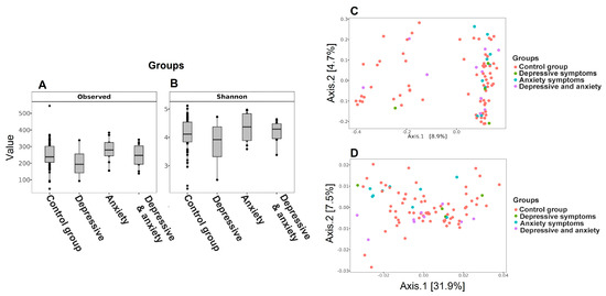 Alpha and beta diversity of the groups. (A) Box plot showing the alpha diversity of the bacterial communities based on the observed OTUs. (B) The Shannon index between the groups. (C) PCoA plot of the unweighted UniFrac distances and (D) weighted UniFrac distances of the groups using the rarefied OTU matrix. Pink dots represent the control group (OCG), green dots represent the group with depressive symptoms (OD), blue dots represent the group with anxiety symptoms (OAx), and purple dots represent the group with depressive and anxiety symptoms (ODAx).