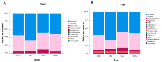 At the class level, Bacteroidia (MRA = 47.66%) was the most common class in all groups, followed by Clostridia (MRA = 30.45%) and Gammaproteobacteria (MRA = 3.72%), although only Gammaproteobacteria were statistically significant (p = 0.042). At MRA < 1%, we found statistical differences in Verrucomicrobiae (p = 0.024) and the Fusobacteriia phylum (p < 0.001) between the groups (Table A2). Per group, we found that Bacteroidia (MRA = 58.82%) and Clostridia (MRA = 17.64%) were the predominant classes for OD, while Clostridia (MRA = 33.90%) and Gammaproteobacteria (MRA = 8.80%) were the predominant classes for OAx (Figure 2B).