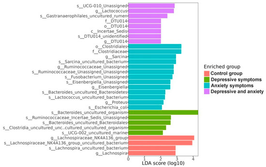 Linear discriminant effect size analysis describing the characteristic ASVs of the taxonomic profile of the control group (OCG), individuals with depressive symptoms (OD), individuals with anxiety symptoms (OAx), and individuals with both depressive and anxiety symptoms (ODAx). Only ASVs with LDA scores (log10) > 2 are shown.