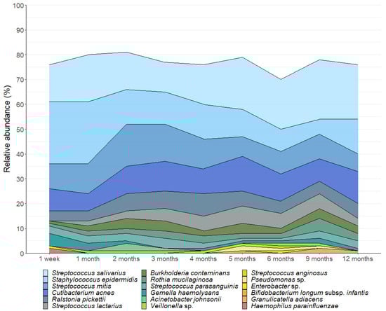 Of the 18 OTUs analyzed here, we detected fluctuations over time in the relative abundance of six (Figure 5). Of these, two differed at one time point only (Rothia mucilaginosa, elevated at 9 months, p = 0.007; Streptococcus salivarius, reduced at 1 week, p = 0.036), while four (Staphylococcus epidermidis, Streptococcus lactarius, Enterobacter sp., and Granulicatella adiacens) underwent multiple changes over time. The relative abundance of S. epidermidis decreased over the course of lactation, while the relative abundance of Enterobacter sp., G. adiacens, and S. lactarius increased.