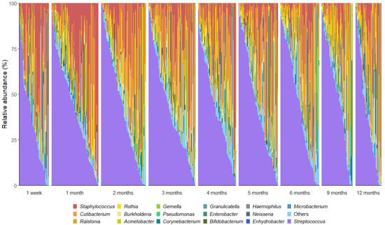 Genus-level interindividual variation in human milk microbiota profiles across the first 12 months postpartum. Genera that made up <2% mean relative abundance are grouped together as “others”.