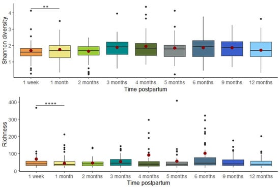 Alpha diversity was significantly elevated at 1 week compared to 1 month postpartum. The box plots represent Shannon diversity/richness at each time point. The model-predicted means at each time point are represented by red dots. The model-predicted means for richness are not estimable at 9 and 12 months due to insufficient data (** p < 0.01, **** p < 0.0001).