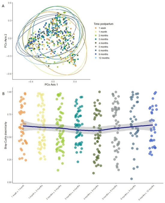 Milk microbiome beta diversity remains largely stable over time. (A) PCoA plot of Bray–Curtis distances between different time points. The ellipses show the 95% confidence level. (B) Volatility of the milk microbiome between subsequent time point pairs. Each point represents one mother’s dissimilarity between two consecutive time points; the LOESS line shows overall trend with the shaded area representing the 95% confidence intervals.