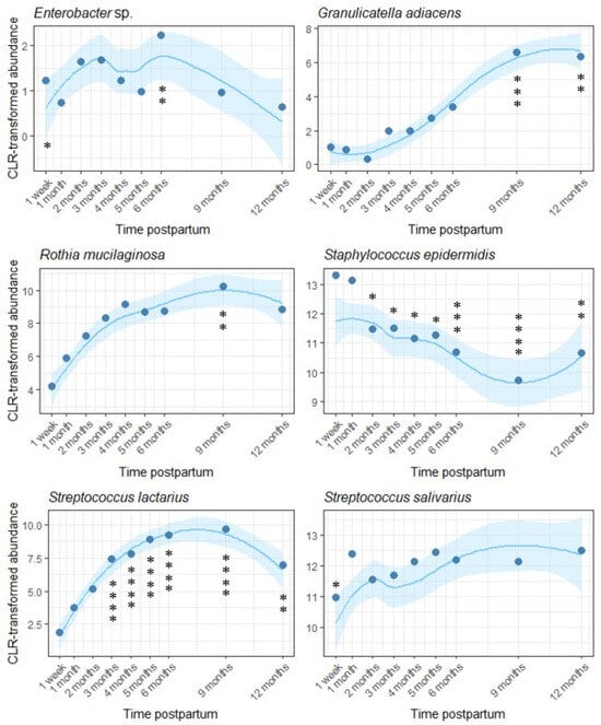 Temporal variation in six OTUs within the human milk microbiota across the first year of lactation. One month postpartum was used as the reference level. Loess lines represent CLR transformed abundance at each time point, and the shaded areas represent the 95% confidence intervals. Model-predicted means at each time point are represented by dots (* p < 0.05, ** p < 0.01, *** p < 0.001, **** p < 0.0001).