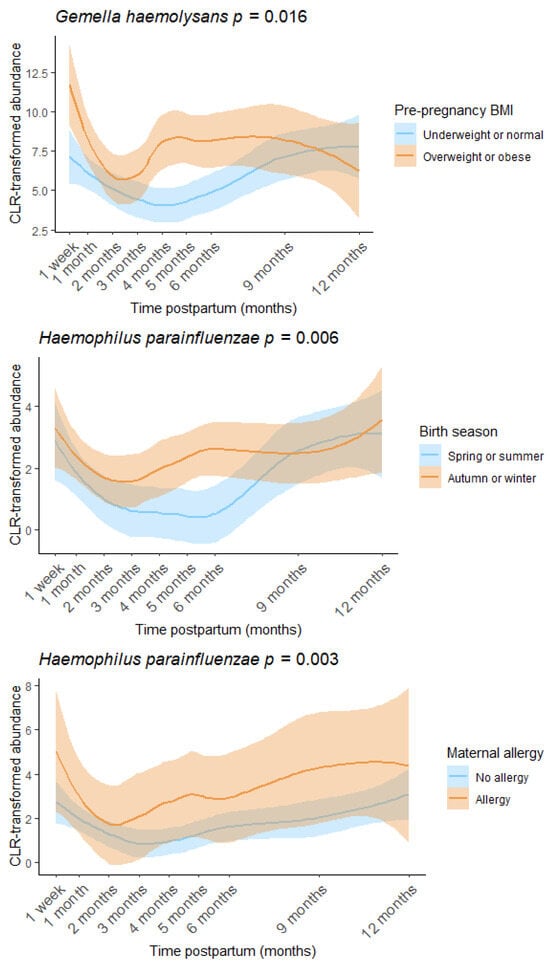 Pre-pregnancy BMI, birth season, and maternal allergy were associated with the human milk microbiome. Loess lines represent CLR transformed abundance at each time point, and the shaded areas represent the 95% confidence intervals.