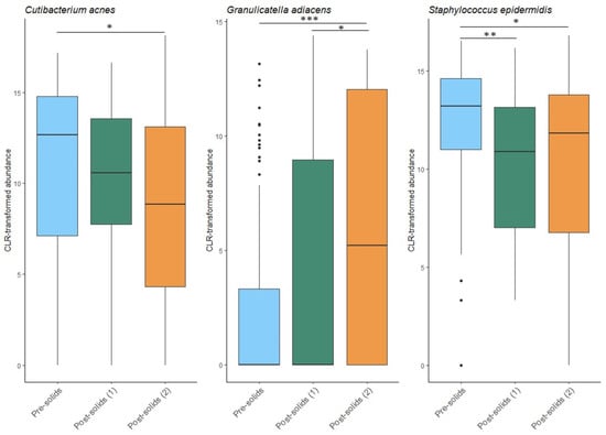 Impact of solid food introduction on the human milk microbiota. Pre-solids: the sample collected immediately prior to the first introduction of solid foods. Post-solids (1): the first sample collected after the introduction of solid foods. Post-solids (2): the second sample collected at two sample time points after the introduction of solid foods. * p < 0.05, ** p < 0.01, *** p < 0.001.
