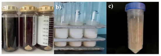 Samples from the Kl. pneumoniae 12 BL, P. aeruginosa 3 BL, and Acinetobacter sp. 24 BL consortium at different stages of processing: (a) biomass before treatment (live cells), (b) after disruption using a French press, and (c) lyophilized lysate.