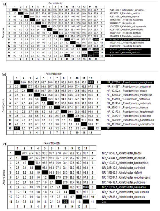 In this study, 25 clinically significant, antibiotic-resistant bacterial strains were isolated from hospital patients and environments in Kazakhstan. These strains demonstrated high viability (up to 1010 CFU/mL), broad-spectrum multidrug resistance, and biocompatibility, which are essential characteristics for developing industrially valuable BLs. Among them, three priority pathogens (Kl. pneumoniae 12 BL, P. aeruginosa 3 BL, and A. baumannii 24 BL) were selected based on their clinical relevance, resistance profiles, and growth characteristics for inclusion in a polyvalent consortium.