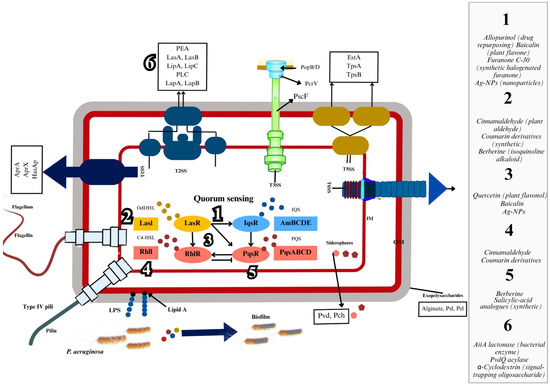 - Brindhadevi, K.; LewisOscar, F.; Mylonakis, E.; Shanmugam, S.; Verma, T.N.; Pugazhendhi, A. Biofilm and Quorum Sensing Mediated Pathogenicity in Pseudomonas aeruginosa. Process Biochem. 2020, 96, 49–57. [Google Scholar] [CrossRef]