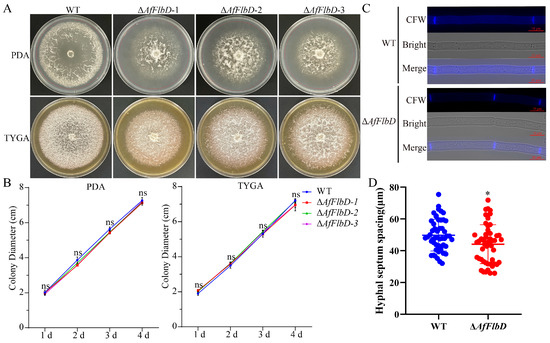 Comparisons of mycelial growth and cell length of the WT and ΔAfFlbD strains. (A) Colony morphologies of fungal strains cultured at 28 °C for 4 days. (B) Comparisons of mycelial growth rates. (C) CFW staining of hyphae of WT and ΔAfFlbD strains. (D) Hyphal septum spacing statistics. (Student’s t-test; * p < 0.05).