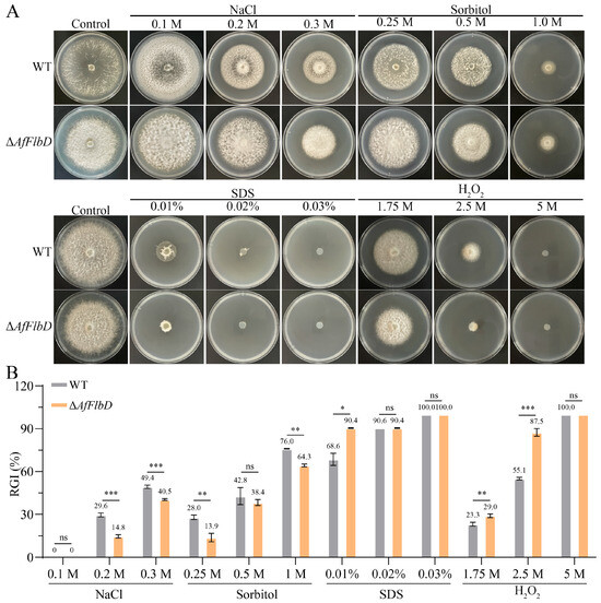 Furthermore, to investigate the role of AfFlbD in stress adaptation, A. flagrans was cultured on PDA supplemented with gradient concentrations of NaCl, sorbitol, sodium dodecyl sulfate (SDS), and H2O2. All tested stressors inhibited growth in both the WT and ΔAfFlbD strains (Figure 4A). Compared with the WT, the RGI values of the ΔAfFlbD strains on the media containing NaCl (0.2 M, 0.3 M) and sorbitol (0.25 M, 0.5 M, 1 M) were reduced, indicating that the sensitivity of the ΔAfFlbD strains to NaCl and sorbitol was significantly decreased (Figure 4B). In contrast, both the WT and ΔAfFlbD strains ceased growth on the medium containing SDS at concentrations of 0.02% and 0.03% (Figure 4A). Compared with WT, the ΔAfFlbD strains had higher RGI values on the media containing SDS (0.01%) and H2O2 (1.75 mM and 2.5 mM), indicating that the sensitivity of the ΔAfFlbD strains to SDS and H2O2 was increased (Figure 4B).