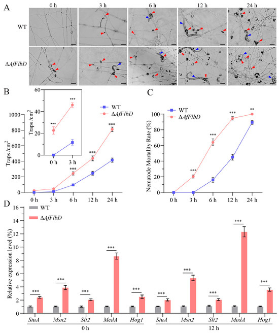 Comparisons of trap formation and nematode predation efficiency of the WT and ΔAfFlbD strains. (A) Trap formation at different time points (0 h, 3 h, 6 h, 12 h, and 24 h); scale bar: 50 μm. Red triangles: traps; blue triangles: nematodes. (B) Numbers of traps at different time points. (C) Nematode mortality. (D) Analysis of the relative expression levels of five trap-positive regulatory genes in WT and ΔAfFlbD strains using qRT-PCR. (Student’s t-test; ** p < 0.01; *** p < 0.001.).