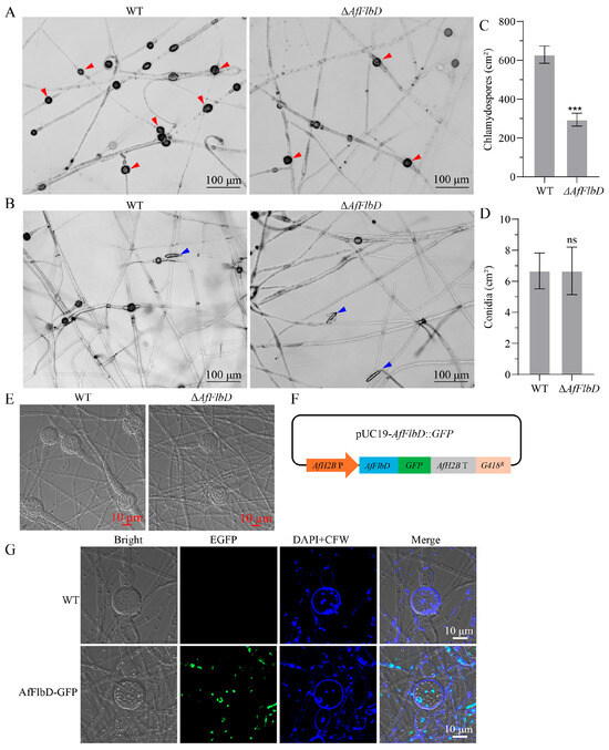 Functional analysis of AfFlbD in chlamydospore and conidia formation. (A) The chlamydospores of the WT and ΔAfFlbD strains after 14 days of culturing on WA medium. Red triangles: chlamydospores. (B) The conidia of WT and ΔAfFlbD strains after 14 days of culturing on WA medium. Blue triangles: conidia. (C) The number of chlamydospores. (D) The number of conidia. (E) Comparisons of chlamydospore morphology. (F) Schematic diagram of plasmid construction for AfFlbD-GFP fusion protein expression. (G) Confocal microscopy analysis of AfFlbD subcellular localization. (Student’s t-test; *** p < 0.001).