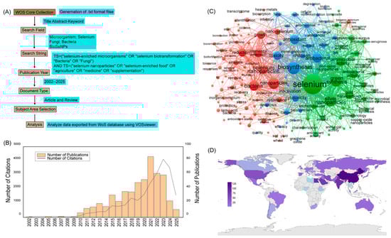 Overview of the bibliometric analysis process and research trends in the field of selenium-enriched microorganisms. (A) Flowchart of the literature retrieval strategy used for bibliometric analysis based on the Web of Science Core Collection. (B) Annual number of publications (2002–2025) related to selenium-enriched microorganisms. (C) Keyword co-occurrence network generated using VOSviewer. (D) Number of Publications on Selenium-Enriched Microorganisms by Country (2002–2025).