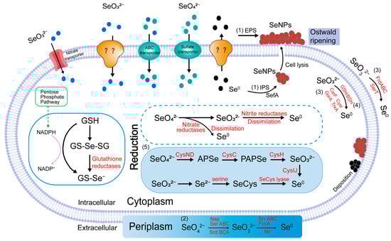 Microorganisms absorb inorganic selenium from their environment primarily in the form of selenite and selenate [86]. Although these inorganic selenium compounds serve as a primary selenium source, they can be toxic. Thus, microorganisms must reduce these compounds into less toxic or non-toxic forms to mitigate their harmful effects [12]. Wang et al. [15] elucidated the reduction mechanisms of selenate and selenite, as well as the biosynthesis mechanisms of biogenic selenium nanoparticles (BioSeNPs) during these processes.