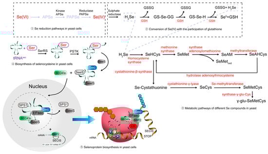 In yeast cells, the metabolism of selenium involves several key steps, beginning with the reduction of Se(VI) to Se(IV), which is catalyzed by kinases, APS reductase, and other reductases (Figure 3). Glutathione (GSH) plays a crucial role in this reduction process, as it participates in the conversion of Se(VI) to its active form, Se(IV), which can then be incorporated into selenoproteins. Following this, selenium is integrated into amino acids, particularly SeCys and SeMet, through complex biosynthesis pathways. The enzyme cystathionine-β-synthase is involved in the formation of SeCys, while methionine synthase and SeMet synthase facilitate the biosynthesis of SeMet. Additionally, SeCys is metabolized into various selenium compounds, including Se-methylselenocysteine (SeMeCys), by specific methyltransferase enzymes. SeCys is incorporated into selenoproteins in yeast cells, with the help of specialized selenocysteine tRNA (Sec-tRNA) and the Sec insertion machinery. This complex network of pathways ensures the efficient bioaccumulation and utilization of selenium, contributing to the production of bioactive selenium compounds essential for yeast growth and function.