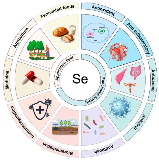In recent years, selenium-enriched microorganisms have gained increasing attention in both scientific research and practical applications [12]. Through processes such as bioaccumulation and biotransformation, microorganisms can effectively absorb inorganic selenium from the environment and convert it into organic selenium compounds, including seleno-amino acids and selenoproteins, which are more easily absorbed and utilized by the human body [14]. Consequently, selenium-enriched microorganisms hold great promise not only in enhancing selenium bioavailability but also for their versatile applications in food, dietary supplements, agriculture, and medicine. Therefore, this review provides a comprehensive overview of recent advances in the classification of selenium-enriched microorganisms, their selenium metabolism and transformation mechanisms, production strategies, and multi-disciplinary applications. In addition, current challenges and future research directions in this emerging field are also discussed.