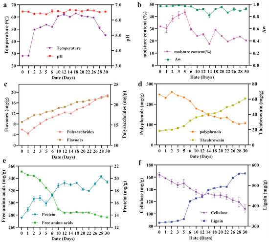 Determination of physicochemical parameters and main chemical components of Pu-erh tea during pile fermentation. (a) pH and temperature. (b) Moisture content (%) and water activity (Aw). (c) Polysaccharide and flavone content (mg/g). (d) Polyphenol and theabrownin content (mg/g). (e) Protein and free amino acid content (mg/g). (f) Cellulose and lignin content (mg/g). All experiments were repeated in triplicate.
