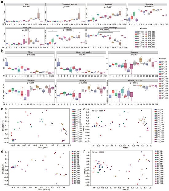 Alpha diversity analysis revealed distinct temporal patterns in the prokaryotic and eukaryotic communities during pile fermentation. Specifically, a total of 39,995 clean reads for the 16S rRNA V3–V4 region and 44,159 clean reads for the fungal ITS1 region were generated, with average coverage of 99.58% and 95.99%, respectively. This depth was sufficient for downstream diversity and network analysis. In the prokaryotic microbiota (Figure 2a), richness and diversity metrics—including Chao1, Shannon, and Simpson indices—increased during the early stages (BPT_0D to BPT_22D), peaking on day 26 (Shannon = 0.91, p < 0.05), followed by a gradual decline toward day 30. This trend likely reflects the initial availability of abundant carbon sources that support microbial proliferation, followed by substrate depletion and ecological filtering favoring dominant taxa. Notably, the alpha diversity values of unfermented tea (BF_0D) were significantly higher than those of most fermented samples, indicating a richer but more heterogeneous microbial community at baseline. In contrast, the eukaryotic richness declined steadily throughout the fermentation process, although without statistically significant variations between stages, suggesting greater structural stability among fungal communities (Figure 2b).