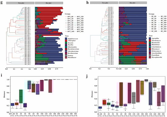 Beta diversity analysis revealed the clear temporal structuring of the microbial communities during Pu-erh tea pile fermentation. The prokaryotic profiles from the middle to late stages (second to fifth fermentation cycles) exhibited strong clustering in the PCoA plots (Figure 2c,e), indicating increased homogeneity and ecological stabilization, with Staphylococcus (51.79%, 71.40%) and Kocuria (45.93%, 25.62%) as the dominant genera at BPT_28D and BPT_30D. The high structural similarity between these samples further confirmed the stability of the prokaryotic communities at the end of fermentation. Conversely, sample BPT_10D exhibited distinct separation from other clusters, likely due to the transient dominance of unclassified Enterobacteriaceae (35.31%). Eukaryotic communities displayed a different pattern, with stage-specific periodic clustering throughout fermentation. The PCoA analysis (Figure 2d,f) showed that the eukaryotic communities in the early stages (BF_0D-BF_10D) clustered together, as did those in the later stages (BF_12D-BF_30D), indicating temporal shifts in composition despite overall structural stability. Hierarchical clustering analysis further revealed intersample differences, as shown in the tree plot (Figure 2g,h, left) and the distribution of the top 10 genera (Figure 2g,h, right). At the eukaryotic level (Figure 2h), notable genera included Aspergillus, Thermomyces, Rasamsonia, and Blastobotrys, which were consistently abundant, although they varied in relative abundance across fermentation stages. In contrast, the prokaryotic composition (Figure 2g) showed more dynamic succession, with Bacillus dominating in the early stages and Staphylococcus, Kocuria, and Brachybacterium gradually becoming dominant later. Notably, such bacterial turnover contrasts with the relatively stable fungal structure. Interestingly, the opposite succession trends were observed in Kombucha fermentation, highlighting the distinct microbial ecology and environmental selection pressure unique to Pu-erh tea pile fermentation [28]. Further analysis of intergroup differences (Figure 2i,j) revealed that changes in prokaryotic composition were statistically significant, whereas eukaryotic distributions remained more consistent, supporting the interpretation that bacterial communities underwent substantial ecological restructuring, while fungal communities maintained compositional resilience throughout the fermentation process. In conclusion, these findings not only confirm well-established trends in microbial succession but also provide novel insights into the continuous evolution of the microbial communities throughout Pu-erh tea fermentation. By capturing detailed changes during the entire fermentation cycle, our work offers a more comprehensive view of the microbial dynamics and sets the stage for future studies focused on optimizing the fermentation process.