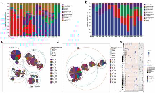 Relative abundance of microbial communities of Pu-erh tea during different periods. Bar charts of prokaryotic (a) and eukaryotic (b) microbial communities at the genus level. Classification level trees of prokaryotic (c) and eukaryotic (d) microorganisms. (e) Phylogenetic tree plot of prokaryotic communities.