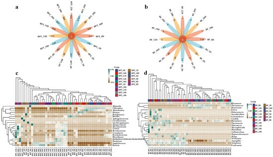 In parallel, major chemical components underwent substantial transformation. The concentrations of soluble polysaccharides, total flavonoids, theabrownin, protein, and lignin increased significantly over time, rising from 13.89, 8.79, 18.36, 275.63, and 316.67 mg/g to 22.31, 18.45, 60.90, 333.96, and 558.33 mg/g, respectively (Figure 1c,e,f). These increases suggest the microbial-induced degradation of cell wall polysaccharides and the biosynthesis of secondary metabolites, contributing to flavor- and health-related attributes. Conversely, tea polyphenols, free amino acids, and cellulose showed marked reductions, by 56.8% (107.22 mg/g), 35.5% (13.61 mg/g), and 33.9% (108.33 mg/g), respectively (Figure 1d–f), likely due to microbial utilization and enzymatic degradation. Together, these results demonstrate that pile fermentation not only modulates the physicochemical environment but also drives the bioconversion of key tea constituents. The observed trends lay the groundwork for subsequent microbial succession and metabolite production, emphasizing the importance of environmental monitoring and control in regulating the fermentation quality and consistency [27]. One limitation of this study is that the tea samples were collected exclusively from the middle layer of the fermentation pile. Although this layer is widely recognized as the most active zone in terms of microbial succession and enzymatic metabolism, it may not fully capture the vertical heterogeneity across the pile. Future studies are encouraged to incorporate stratified sampling across the top, middle, and bottom layers to better resolve the spatial microbial and metabolic differences under pile fermentation conditions.