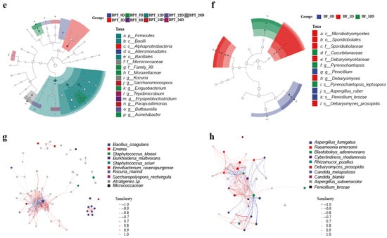 Microorganisms perform a wide array of biological functions, secreting numerous enzymes during growth that catalyze various chemical reactions within the fermented tea pile [29]. To dissect species-level differences and intertaxa associations during Pu-erh tea pile fermentation, we performed integrated analyses combining Venn diagrams, LEfSe biomarker discovery, and microbial co-occurrence networks. The Venn analysis (Figure 4a,b) revealed five and six core species that were consistently present across all fermentation stages in the prokaryotic and eukaryotic communities, respectively. However, the number of unique taxa was markedly higher in prokaryotes (ranging from 58 to 2151) than in eukaryotes (1 to 118), suggesting greater ecological plasticity in bacterial communities.