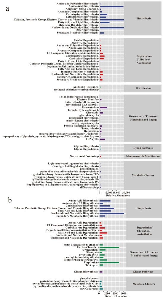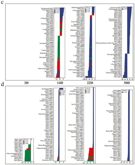 In microbial ecology, assessing not only the taxonomic composition but also the functional capacity of microbial communities is essential to understanding ecosystem dynamics. To infer the functional potential of the Pu-erh tea pile fermentation microbiota, we utilized PICRUSt2 to predict metagenomic profiles based on the 16S and ITS amplicon data. The predicted functional categories in prokaryotes encompassed biosynthesis, degradation/utilization/assimilation, detoxification, energy generation, glycan pathways, macromolecule modification, and metabolic clusters (Figure 5a). In contrast, eukaryotic communities lacked the detoxification and macromolecule modification categories (Figure 5b), indicating differential ecological roles between domains. Notably, prokaryotes exhibited higher functional richness and showed significant upregulation in pathways associated with energy metabolism and substrate degradation, which are crucial for biomass turnover and aroma compound release. To explore temporal shifts in microbial function, we compared four key fermentation stages (3D, 14D, 22D, and 30D), using unfermented tea (BF_0D) as a baseline. At 3D, few significant changes were observed, whereas, by 14D, prokaryotic pathways such as TEICHOICACID-PWY, LACTOSECAT-PWY, PWY-5304, and PWY-922 were markedly upregulated (Figure 5c), implicating active cell wall metabolism, carbohydrate degradation, and short-chain fatty acid biosynthesis—all of which contribute to tea flavor formation and microbial adaptation. In contrast, eukaryotic communities (Figure 5d) predominantly exhibited downregulation across fermentation stages, except for the upregulation of TYRFUMCAT-PWY, a pathway linked to tyrosine catabolism that may indirectly modulate volatile compound profiles. These functional predictions highlight domain-specific metabolic contributions during fermentation and offer mechanistic insights into the transformation of bioactive compounds and sensory traits in Pu-erh tea.