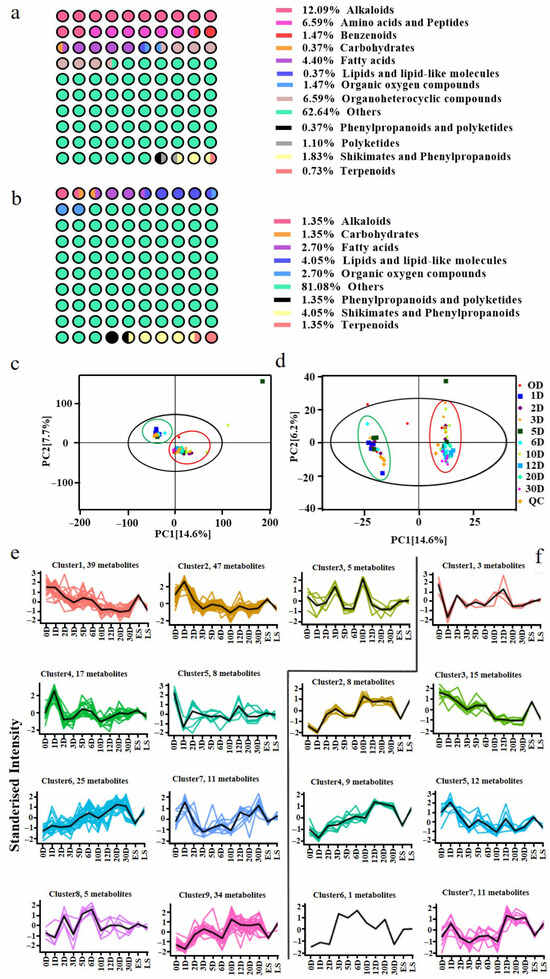 To explore the temporal shifts in the metabolite composition and their potential associations with microbial dynamics, non-targeted metabolomics profiling was conducted on ten fermentation samples collected at 0, 1, 2, 3, 5, 6, 10, 12, 20, and 30 days. A total of 36,747 molecular features were detected, with 30,435 in positive ion mode and 6312 in negative ion mode. Based on HMDB and KEGG annotations, 273 and 74 metabolites were identified in positive and negative mode, respectively. These compounds included alkaloids, amino acids, fatty acids, peptides, shikimates, and phenylpropanoids (Figure 6a,b), representing a chemically diverse profile consistent with complex microbial biotransformation. Principal coordinate analysis (PCoA) revealed the clear clustering of early-stage samples (0D–6D) versus later-stage samples (10D–30D), indicating substantial shifts in metabolite profiles over time (Figure 6c,d). The high reproducibility of QC samples affirmed the reliability of the data. Based on this clustering pattern, we defined two groups for further analysis: early stage (ES) and late stage (LS). K-means clustering (based on VIP > 1 and p < 0.05) identified nine significant metabolite trends in positive mode (Figure 6e), with 2-acetyl-1-pyrroline and 2,5-dimethylpyrazine being key contributors to the popcorn- and roasted-like aromas accumulating prominently at 30D [30]. In negative mode (Figure 6f), seven trends were observed, including elevated levels of health-related unsaturated fatty acids such as arachidonic acid and linolenic acid in the LS group, both known for their anti-inflammatory properties [31]. Notably, the differential metabolite profiles appeared to stabilize toward the end of fermentation (20D–30D), suggesting the establishment of a relatively mature and functionally stable microbial ecosystem. Generally, these metabolites offer opportunities to improve the flavor profile and functional attributes of Pu-erh tea. For instance, controlling the fermentation conditions to enhance the production of these key metabolites could lead to more consistent flavor profiles and health benefits in industrial-scale tea production. These findings align with microbial succession patterns and provide metabolite-level evidence for quality development and potential functional benefits during Pu-erh tea fermentation [32].
