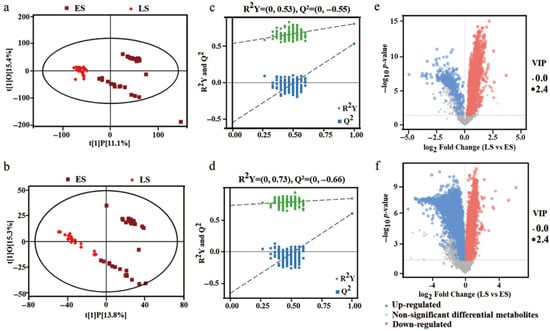 The feasibility of the OPLS-DA model was further assessed through permutation testing, with the results depicted in Figure 7c,d. The horizontal axis in the figure indicates the permutation retention (with a retention value of 1), while R2Y and Q2 denote the values of the original OPLS-DA model. It is evident that the R2Y and Q2 values in the random model for both positive (A) and negative (B) ion mode decrease as permutation retention is reduced, suggesting that the original OPLS-DA model did not exhibit overfitting. Moreover, the model exhibited good interpretability (R2) and predictability (Q2), indicating that it accurately reflected the metabolite differences between ES and LS samples. Following this analysis, and in conjunction with the statistical results of unit and multivariate variables, differential metabolites between the LS and ES groups were identified with VIP > 1 and p < 0.05. As shown in Figure 7e, a total of 8133 material peaks exhibited significant differences between the LS and ES groups in positive ion mode, of which 4525 peaks were significantly upregulated and 3607 peaks were significantly downregulated compared to the ES group. In negative ion mode (Figure 7f), a total of 1985 material peaks showed significant differences between the LS and ES groups, including 1645 peaks that were significantly upregulated and 340 peaks that were significantly downregulated compared to the ES group.