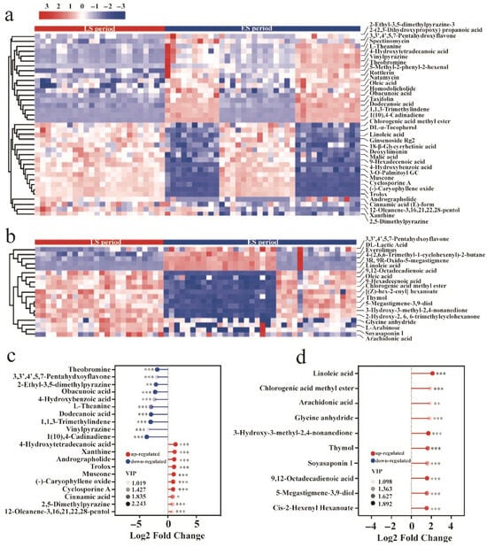 Screening and identification of differential metabolites. The clustering results for differential metabolites in ES/LS in positive (a) and negative (b) ion mode. The tinder plots of the differential metabolites in LS to ES in positive (c) and negative (d) ion mode. *: p < 0.05; **: p < 0.01; ***: p < 0.001.