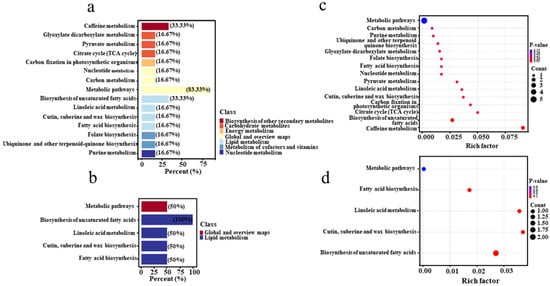 Enrichment of KEGG metabolic pathways. Metabolic pathway classification of differential metabolites in ES/LS in positive (a) and negative (b) ion mode. KEGG enrichment maps of differential metabolites in ES and LS in positive (c) and negative (d) ion mode.