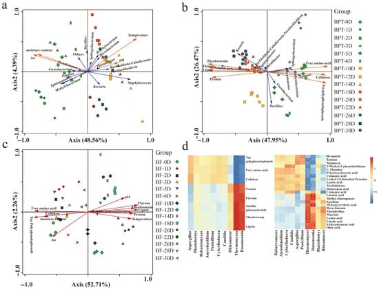 Correlation analysis among microbial composition and biochemical parameters and metabolites The redundancy analysis of the dominant prokaryotic genera in BPT with biochemical parameters (a) and the main chemical components (b). The redundancy analysis of the dominant eukaryotic genera and biochemical indicators (c). Correlations between microbiome and main chemical components (d). * indicates p < 0.05; ** indicates p < 0.01.