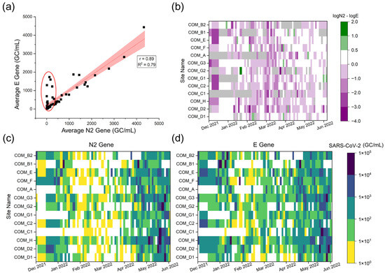 Comparison of N2 and E gene concentrations (GC/mL) among all samples. (a) A linear regression between the N2 and E gene concentrations for the entire study, with the anomalies of interest circled in red. (b) The heat map of SARS-CoV-2 concentration differences determined by N2 or E gene at each manhole site (presented as logN2-logE). Gray shading represents a sample for which the calculation could not be performed due to missing values. (c) SARS-CoV-2 concentrations determined by N2 gene, and (d) SARS-CoV-2 concentrations determined by E gene.