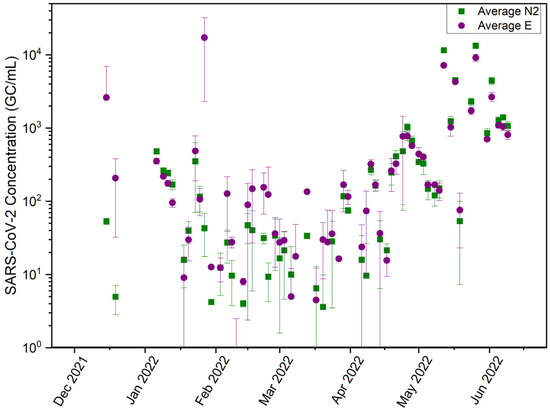 The relationship between SARS-CoV-2 concentrations and the discrepancies between the two genes was analyzed further using data collected from one of the manhole sites, which is also a confluence point (COM_H). This site serves a population of over 2500 students and is centrally located in the middle of campus to serve an expansive area of undergraduate and graduate student housing communities and receives consistent wastewater flows (Figure S1). At this site, the average N2 concentrations ranged from 0 to 1.33 × 104 genome copies per milliliter (copies/mL), with an average of 7.74 × 102 copies/mL, while the E gene ranged from 0 to 1.72 × 104 copies/mL with an average of 9.08 × 102 copies/mL (Figure 2). The average E gene concentration exceeded the N2 gene concentration by over 57% of the time (Figure 2). The exceeding concentrations were more frequently observed when the SARS-CoV-2 concentrations were below 100 copies/mL (Figure 2). In less than 13% of the time, higher N2 gene concentrations were observed when the SARS-CoV-2 concentrations were above 1000 copies/mL for both gene targets, especially in May and June, when clinical cases were higher [33]. This analysis over the expansive dataset from 13 collection sites and a 6-month period confirms that the N2 gene is a more efficient target when the wastewater viral concentration is high, while the E gene performs better when the viral concentration is low.