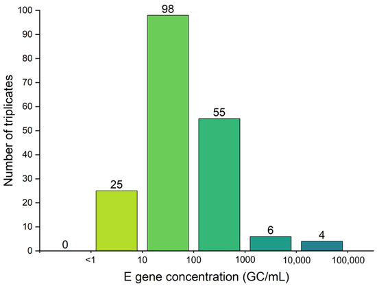 From a public health perspective, missing a positive detection is more consequential than measuring the exact virus concentration, as it could delay recognition of a new pandemic wave and slow the public health response. Considering this, a more detailed assessment of SARS-CoV-2 data was performed for every individual assay in triplicates where the N2 gene was detected in none of the three assays, while the E gene target was detected at adequate levels in all triplicates for the same sample. This analysis intends to reveal misdiagnosis of positive samples due to the low concentration of viruses. As shown in Figure 3, there were 188 instances where the N2 gene was not detected, while E gene was detected in all triplicates. In contrast, there were 71 instances where E gene was not detected, while a successful amplification of N2 gene target was observed in the same sample. Figure 3 shows the frequency distribution of E gene concentrations, when N2 was not detectable (concentration = 0 GC/mL). Among the 188 instances, the majority (52.1%) of instances showed amplification between 10 and 100 copies/mL, indicating low level of COVID-19 cases among the community. The other 34.6% of instances revealed SARS-CoV-2 concentrations > 100 copies/mL, suggesting moderate to severe infection levels in the community.