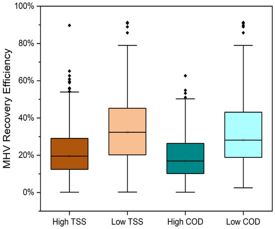 To further evaluate the effects, TSS and COD data were divided into “high” and “low” categories based on their typical values in domestic raw wastewater reported in the literature [40]. “High” TSS was defined as greater than 300 mg/L and anything less was considered “low” TSS. “High” COD was defined as greater than 1000 mg/L and anything less was considered “low” COD. MHV recovery efficiency was compared between the samples with “high” and “low” TSS and COD to evaluate if there was a significant difference between the groups. The results yielded a Mann–Whitney U = 2.91 × 104, Z-score of −9.21, and p < 0.05 for TSS, and a Mann–Whitney U = 2.64 × 104, Z-score of −9.96, and p < 0.05 for COD, which indicated significant differences between the MHV recovery efficiencies of the “high” and “low” groups. This result suggests that the “low” groups in both instances had a higher recovery efficiency than the “high” groups (negative Z). The sum of ranks (U) was lower for the higher groups, suggesting that higher TSS or COD had lower relative MHV recovery efficiencies. The medians of the lower groups were also higher, further confirming the hypothesis that solids and organics affect viral recovery (Figure 5). This outcome indicates SARS-CoV-2 gene recovery may not be optimal as well and affected by the wastewater matrix.