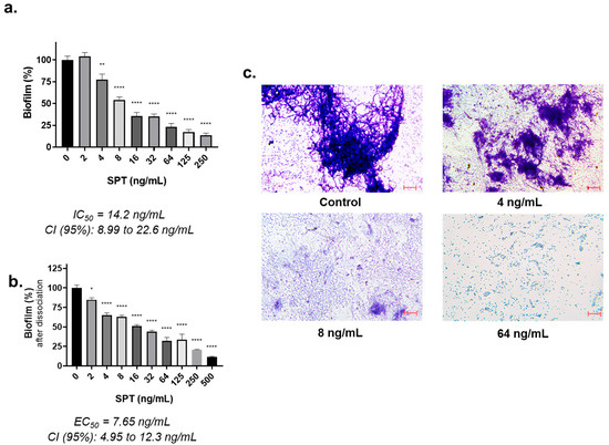 The possible anti-biofilm activity of SPT against E. coli was studied in TCPs. After staining formed biofilms with CV, semi-quantification was performed after the extraction of the dye and spectrophotometric determination at 570 nm. The results of the analysis are provided in Figure 1a. SPT is verified as a strong inhibitor of biofilm formation of E. coli with an IC50 value of 14.2 ng/mL (CI 95%: 8.99 to 22.6 ng/mL). Maximum inhibition of biofilm formation was found at 0.25 μg/mL and was −87% (p < 0.0001) that of the control. In addition, the ability of SPT to disrupt performed biofilms of E. coli on TCPs was also studied, and the results are provided in Figure 1b. SPT treatment significantly detached the biofilm formations in a concentration-dependent manner, with an EC50 calculated at 7.65 ng/mL (CI 95%: 4.95 to 12.3 ng/mL).