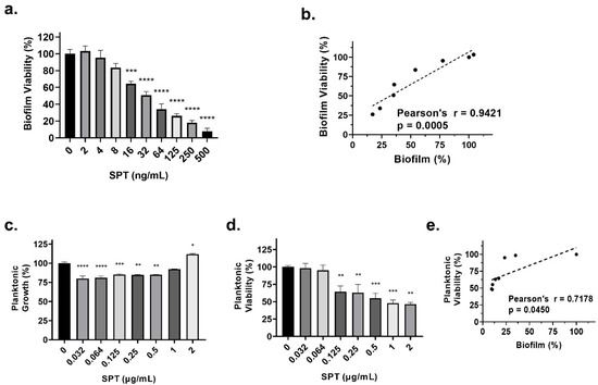 The viability of E. coli biofilm was found to be disrupted by the effect of SPT in a dose-dependent manner (Figure 2a) with maximal inhibition verified at 500 ng/mL (−92%, p < 0.0001). As expected, biofilm viability is perfectly correlated to the inhibition of biofilm formation (Figure 2b), with the statistical analysis resulting in Pearson’s r = 0.9421 and a p-value of 0.0005. A significant decrease in the growth of E. coli bacteria was demonstrated for almost all SPT doses used in terms of culture turbidity (Figure 2c). A maximal reduction in E. coli growth was verified at 0.032 μg/mL SPT and was −20% that of the control culture (p < 0.0001). However, when increasing doses of SPT were employed, turbidity reductions were restricted, with a significant, slight increase at culture turbidity demonstrated at 2 μg/mL of SPT (p = 0.0133). A reduction in the viability of planktonic bacteria was also found (Figure 2d), with maximal inhibition verified at 2 μg/mL (−54%, p = 0.0015). Correlation analysis indicated that reduced bacterial growth does not coincide with biofilm inhibition. On the other hand, the reduction in viability was significantly correlated with biofilm inhibition (Pearson’s r = 0.7178, p = 0.045) (Figure 2e). These results demonstrate that SPT presence can impair E. coli viability, and this effect is strongly associated with the compound’s anti-biofilm potential.