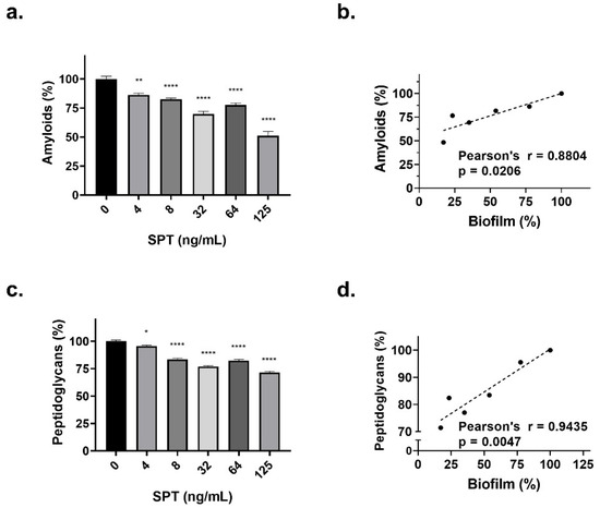 To evaluate the effect of SPT treatment on the E. coli bacteria cell wall, bacteria grown under biofilm conditions were stained with CV, which is a dye that adheres to the PG layer of the bacterial cell wall. The PG titers of SPT-treated and control cultures were then estimated inversely and spectrophotometrically with the retention method, and the normalized results are provided in Figure 3c. The results revealed that E. coli bacteria grown in the presence of SPT reduced levels of PGs, in comparison with control cultures, and SPT may disrupt the physiological structure of the cell wall, at least in terms of the PG content. The maximum reduction in PG titers was found at 0.12 μg/mL of SPT, which is −29% that of the control (p < 0.0001). In addition, correlation analysis for the possible interrelation of PG levels with biofilm formation due to the effect of SPT was conducted, the results of which are presented in Figure 3d. Analysis demonstrated that a reduction in the levels of PGs correlates in a statistically significant and positive manner with biofilm inhibition, indicating that alterations in the physiology of the bacterial cell wall may impair its ability to form biofilm, adding another perspective to the anti-biofilm efficacy of SPΤ.