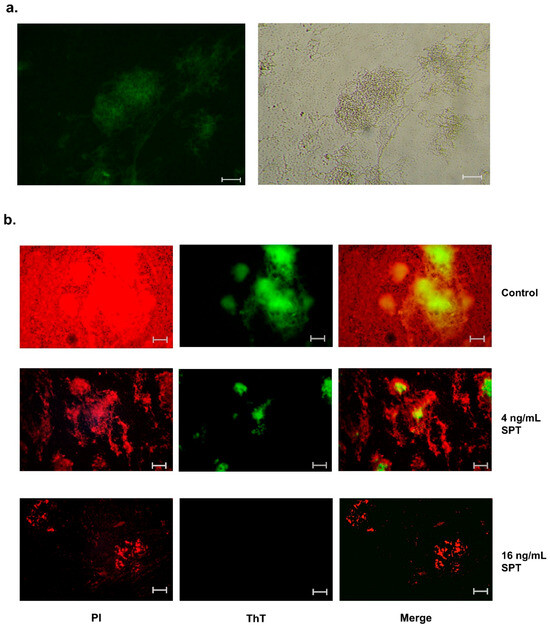 To further elucidate the employment of bacterial amyloids in the biofilm structure, under the effect of SPT or in its absence, biofilms formed in TCPs were stained with ThT and visualized under a fluorescence microscope. Interestingly, the large fibrous mass found in E. coli biofilms (see also Figure 1c) coincides with amyloid staining (Figure 4a). The dissolution of these fibrous formations and reduction in the biofilm mass (PI fluorescence) under the effect of 4 or 16 ng/mL of SPT is associated with a significant drop in ThT fluorescence (Figure 4b). These observations further correlate with the interrelation between biofilm breakage and the functional amyloids of E. coli.