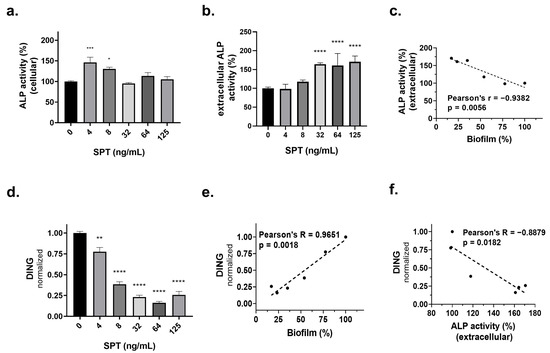 The effect of several concentrations of SPT on the (a) cellular and (b) extracellular activity of alkaline phosphatase (ALP) activity and (d) levels of DING proteins from Escherichia coli ATCC 25922. E. coli was grown under static conditions in glass tubes, and ALP activity was determined after hydrolysis of the pNPP substrate and subsequent reads at 405 nm. For DING levels, bacteria were homogenized and lysates were analyzed with dot blot, employing an antibody against the sequence DINGGGATLPQPLYC of the phosphate ABC transporter periplasmic protein. Correlation analyses were performed to evaluate the possible implication of the (c) extracellular activity of ALP or (e) DING levels on the inhibition of biofilm formation. (f) The correlation of DING levels with extracellular ALP activity. Correlations with p < 0.05 were regarded as statistically significant. The bars in the graphs represent mean values ± SEMs from at least three biological replicates, with the control value set at 100%. Statistical analysis was performed using one-way ANOVA followed by Dunnett’s post hoc test for the correction of multiple comparisons. Statistically significant differences between untreated controls and SPT-treated samples are indicated as follows: p < 0.05 (*), p < 0.01 (**), p < 0.001 (***), and p < 0.0001 (****).