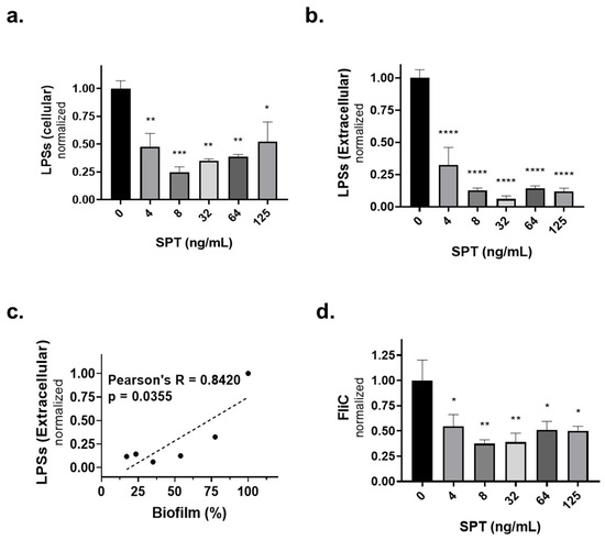 To investigate whether the SPT treatment of E. coli can restrict crucial bacterial virulence factors, the levels of endotoxins, LPSs, and the flagellar component FliC protein were investigated. After bacteria were grown under biofilm conditions, cells were lysed, and LPSs and FliC were detected with a dot blot assay. In addition, dot blot analysis was performed at concentrated growth media to detect extracellular LPSs and FliC. Figure 6a,b present the cellular and extracellular levels, respectively, of LPSs. SPT treatment led to a dose-dependent decrease in both cellular and extracellular LPS titers; the maximum inhibition of cellular LPSs was verified at 0.008 μg/mL of SPT (−75% to that of the control, p = 0.0004), and the maximum inhibition of extracellular LPSs was found at 0.03 μg/mL of SPT (−94% to that of control, p < 0.0001). Correlation analysis proved that the amelioration of extracellular LPS levels under the effect of SPT is positively interrelated with biofilm inhibition (Figure 6c), while such an effect was not verified for cellular LPS levels. As LPSs are the main endotoxins implicated in E. coli infections and biofilm formation, these results further promote SPT as a promising antibacterial agent.