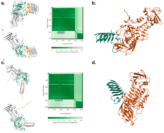 The in silico analysis of interactions between SPT and Csg subunits A and B confirmed the interaction of SPT with both subunits in the same region of SPT (Figure 7). AlphaFold analysis (Figure 7a,c) indicated that the interface of interactions with subunits A and B (green color) is estimated to involve amino acid residues of SPT 147–158 and 214–207. The amino acid residues involved in the interphase of interactions in subunit A are 14–44, and the amino acids involved in subunit B are 18–30, indicated with an orange color.