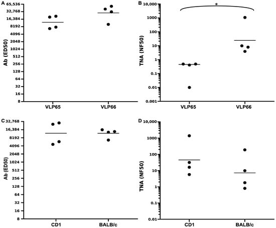 Immunogenicity of the LND-VLPs in mice. Antibody (A) and TNA (B) titers from week-11 sera from groups (n = 4) of F1 mice immunized two times with either the VLP65 or VLP66 nanoparticles in an emulsion with IFA. * GMT neutralization (NF50s) in the sera of mice immunized with the VLP66 was significantly higher than the GMT for mice immunized with the VLP65 (p = 0.029, Mann–Whitney test). Shown in (C,D) are Ab and TNA titers from 11-week sera from groups (n = 4) of CD1 and BALB/c mice immunized two times with the VLP66 in IFA. In all figures, horizontal lines are geometric means.